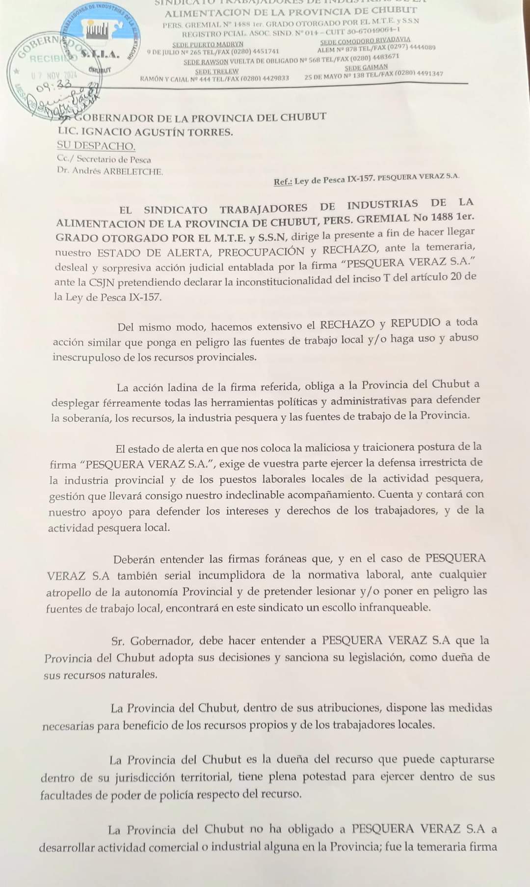 Con copia al Secretario de Pesca, Andrés Arbeletche, el STIA emitió un enérgico comunicado solicitando al gobernador Ignacio Torres una defensa firme de la industria pesquera y los empleos locales, en respuesta a una acción judicial iniciada por Pesquera Veraz S.A. ante la Corte Suprema. La empresa busca declarar inconstitucional el inciso T del artículo 20 de la Ley de Pesca IX-157 de Chubut, norma que protege los recursos y la actividad pesquera provincial.