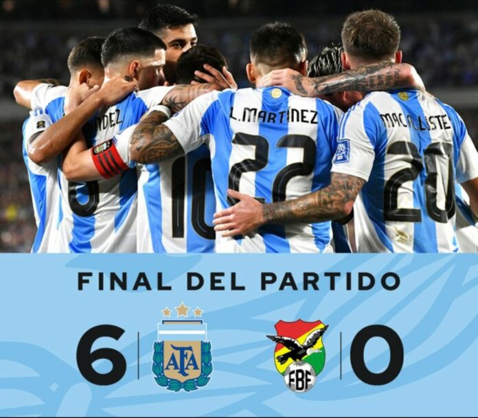 La Selección Argentina le ganó a Bolivia por 6 a 0 en el Estadio Monumental y, de este modo, volvió al triunfo tras caer ante Colombia por 2-1 en septiembre y empatar 1-1 en Venezuela. Messi se lució y convirtió tres goles, mientras que Lautaro Martínez, Julián Álvarez y Thiago Almada anotaron el resto de los tantos.