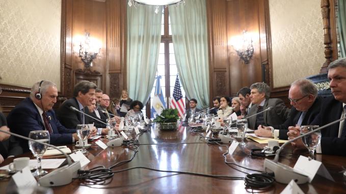 El Secretario de Relaciones Económicas Internacionales de la Cancillería, Embajador Marcelo Cima, junto con el Secretario de Minería de la Nación, Luis Lucero, y el Secretario de Energía, Eduardo Rodríguez Chirillo, se reunió con una Delegación de los Estados Unidos que visita nuestro país, encabezada por el Subsecretario de Crecimiento Económico, Energía y Medioambiente del Departamento de Estado de los Estados Unidos, José Fernández, para el lanzamiento de un Diálogo sobre Seguridad Energética. También participaron del encuentro el Embajador estadounidense en nuestro país, Marc Stanley, además de otros importantes funcionarios del Departamento de Estado y del Departamento de Energía.