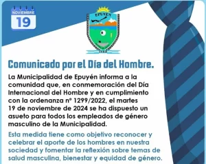 Esta decisión surge a raíz de la ordenanza 1299 y la Ley 26.743 de Identidad de Género dispuesta por el Ejecutivo local. Mediante un comunicado, informaron que «el martes 19 de noviembre de 2024 se ha dispuesto un asueto para todos los empleados de género masculino de la Municipalidad”.