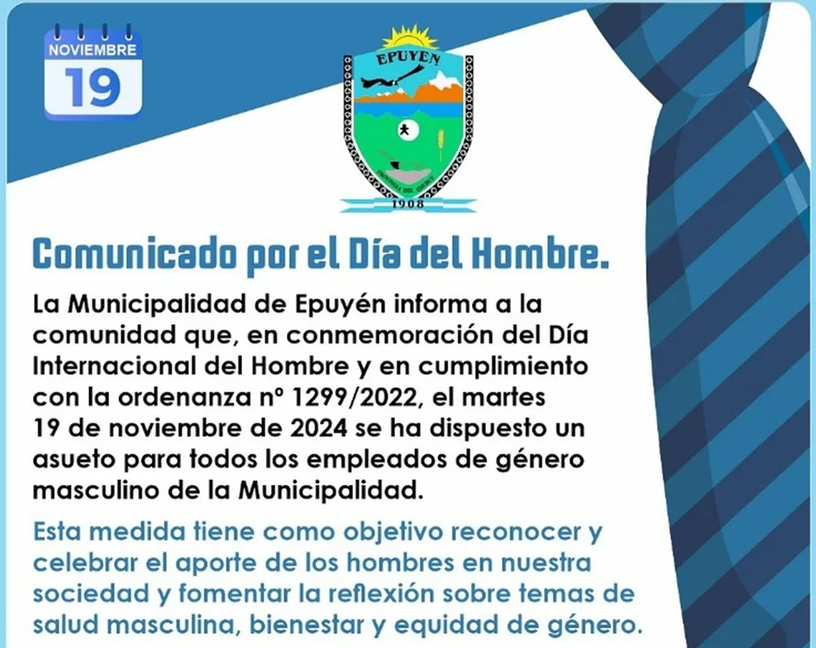 Este martes 19 de noviembre se celebra el «Día Internacional del Hombre» y el municipio de la localidad de Epuyén, tomó una polémica decisión: anunciaron que los empleados del género masculino tendrán asueto. Esto generó rechazo a través de las redes sociales.