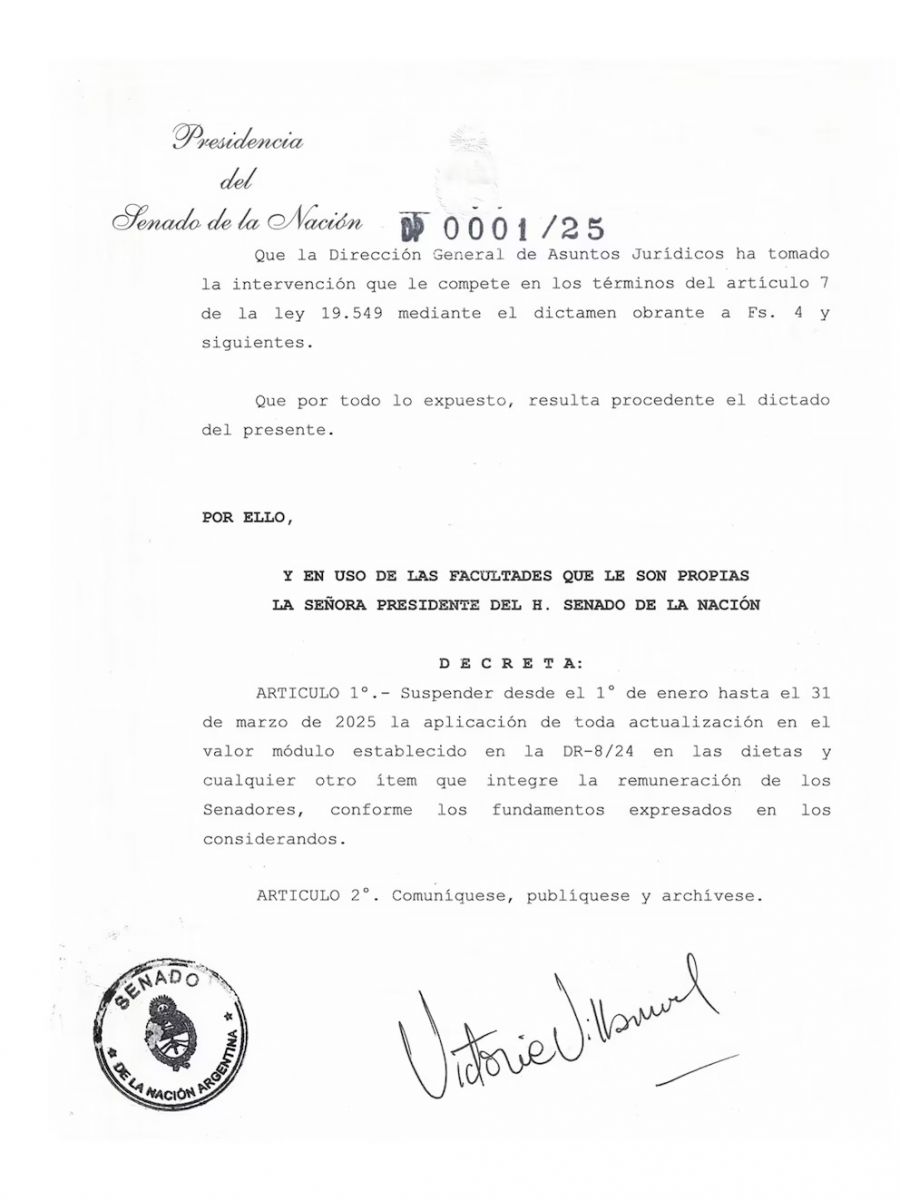 Tras diversas notas presentadas por los jefes de diversas bancadas de la Cámara alta, la titular del Senado firmó este jueves una resolución para prorrogar el congelamiento de las dietas hasta el 31 de marzo próximo. Es decir, hasta un mes después de iniciado el nuevo período de sesiones ordinarias, por lo que una próxima definición en cuanto a este tema quedará en manos del recinto.